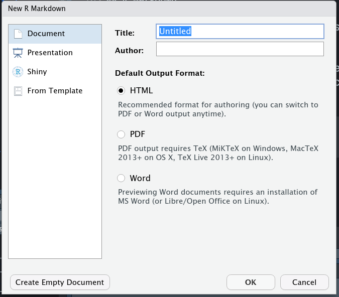 Com o pacote instalado, criamos um novo arquivo markdown acessando o menu File > New File > R Markdown. É apresentada uma tela com opções para o seu novo arquivo markdown, nesta tela voce pode informar um título para o arquivo, bem como a opção de formato de saída desejada. Informe um titulo e pode escolher HTML como saída, já que essas opções podem ser alteradas a qualquer momento no arquivo.