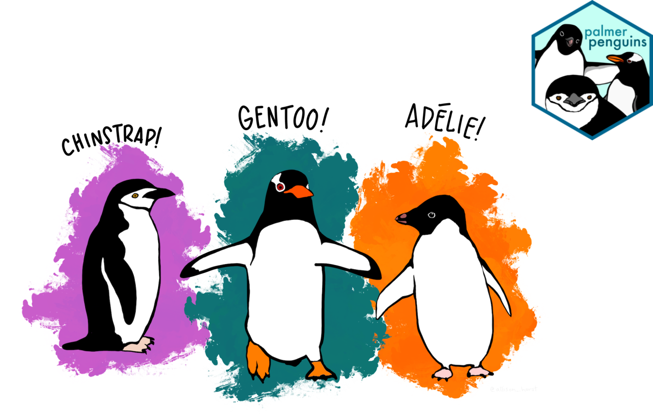 Os dados foram coletados pela Drª Kirsten Gorman na Estação Palmer na Antartica. O projeto faz parte da Rede de Pesquisas Ecológicas de Longa Duração (LTER - Long Term Research Network). O data set apresenta informações de três espécies de pinguins do gênero Pygoscelis que ocorrem no arquipélago de Palmer, esses bonitinhos ai da ilustração, conhecidos comumente como Adélie (Pygoscelis adeliae), Gentoo (Pygoscelis papua) e Chinstrap (Pygoscelis antarticus). São basicamente medidas biométricas de bico e nadadeira, peso corporal, informação de sexo e o ano em que foram amostrados os animais.