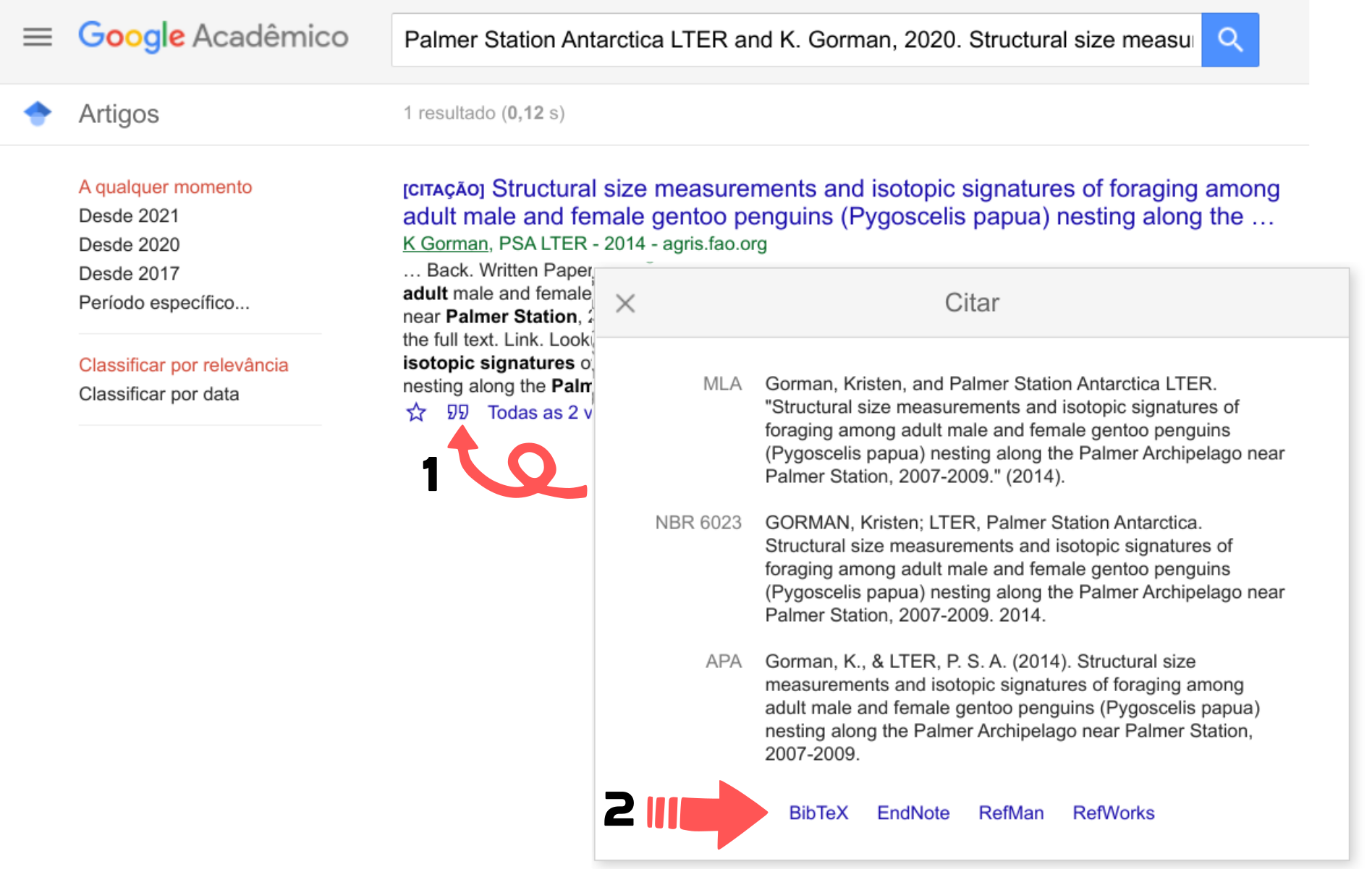 Muito simples não? Mas se existem outros formatos, BibTex é o melhor? Não sei. Pelas minhas pesquisas, o formato padrão e mais utilizado é o JSON, entretanto, a vantagem de utilizar o BibTex é que podemos conseguir a informação de cada obra facilmente neste formato utilizando o Google Acadêmico! Basta acessar a plataforma e buscar pelo título da obra que você deseja a referência. Nos resultados que aparecerão, você verá a imagem de duas aspas ao rodapé do resultado, clicando neste ícone você tem acesso a como referenciar esta obra em diversas opções de normas, ABNT inclusive, embora seja apresentada como NBR. Nesta nova janela que abrir, no rodapé estará o link para acesso ao BibTeX desta obra, só clicar e ser feliz!