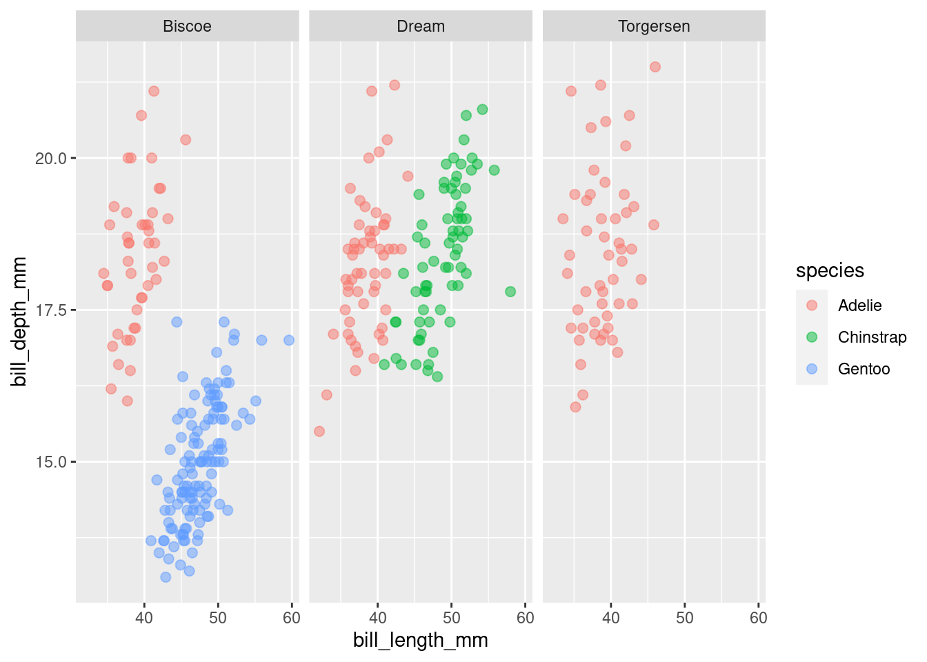 facet_wrap(~ island)Warning: Removed 2 rows containing missing values (`geom_point()`).